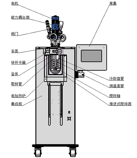 產(chǎn)品功能和特點(diǎn):升降型式,機電一體化設計、結構緊湊;框架支撐結構,配腳輪方便移動(dòng);主體可快開(kāi)設計,開(kāi)閉釜操作方便、快捷;升降輔助機構方便操作,手動(dòng)/電動(dòng)可選;高扭矩磁力傳動(dòng),配優(yōu)選電機,提升運行穩定性;攪拌支持定制槳葉類(lèi)型,適配多樣化攪拌需求;加熱爐傳熱快,均熱效果好,效率可調;真彩色觸控屏,模塊化顯示,控制界面操作簡(jiǎn)潔;支持遠程控制,具備RS485通訊口,配上位機軟件;可顯示工作時(shí)間/溫度/轉速/壓力,PID自整定控溫精準;具備安全連鎖功能,超溫超壓報警;具備數據采集,記錄以及報表導出功能;支持選配加料、計量、取樣、冷凝等擴展功能。